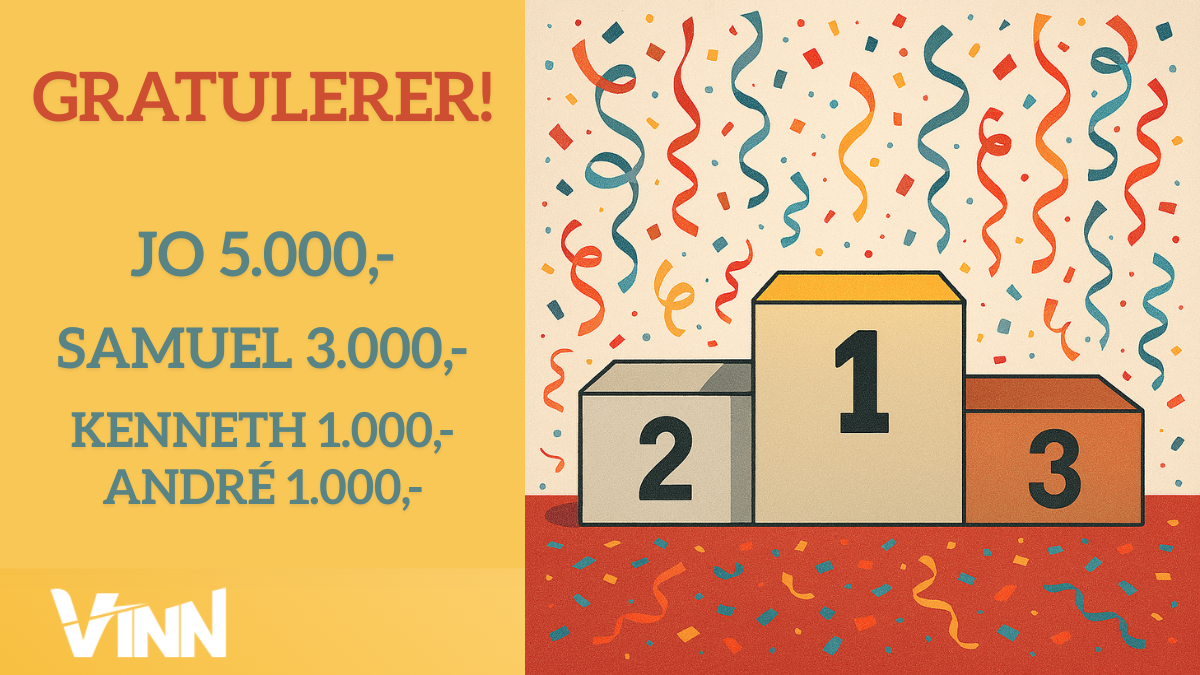 Vi gratulerer Jo, som vinner 5000 kroner hos Vinn! Samuel tok annenplassen og vinner 3000 kroner, mens Kenneth og Andre går det ikke an å skille - så de deler tredjeplassen med en tusenlapp hver - også det hos Vinn.