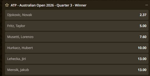 Jeg er ikke sikker på at noen av dem vil ta seg til en semifinale uansett, og skal det bli en overraskelsesmann som tar seg langt så kan det fort være fra denne delen av tablået. Jakub Mensik er det store tsjekkiske talentet, 20 åringen kan fort være topp 10 i løpet av året og et run her i Melbourne vil ta han langt mot det målet. Så er spørsmålet om han foreløpig har fysikken som skal til for å stå en så lang turnering.