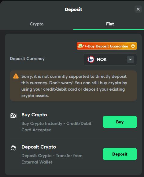 BC.Game tilbyr også innskudd i tradisjonell valuta (for eksempel norske kroner) via Moonpay, en tjeneste der du kan bruke ditt vanlige bankkort for å kjøpe krypto som deretter konverteres automatisk til spillemidler hos BC.Game.