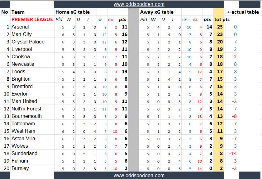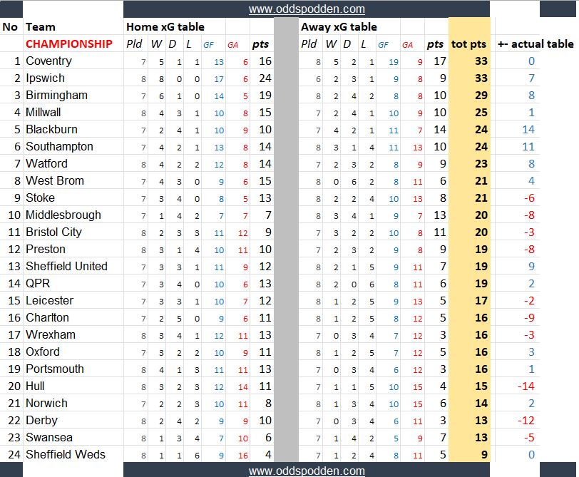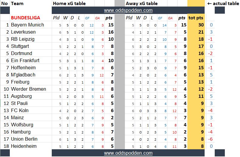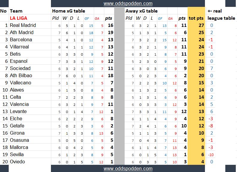 Disse tabellene kan si noe om hvilke lag som har vært heldige/uheldige, overprestert eller underprestert så langt.