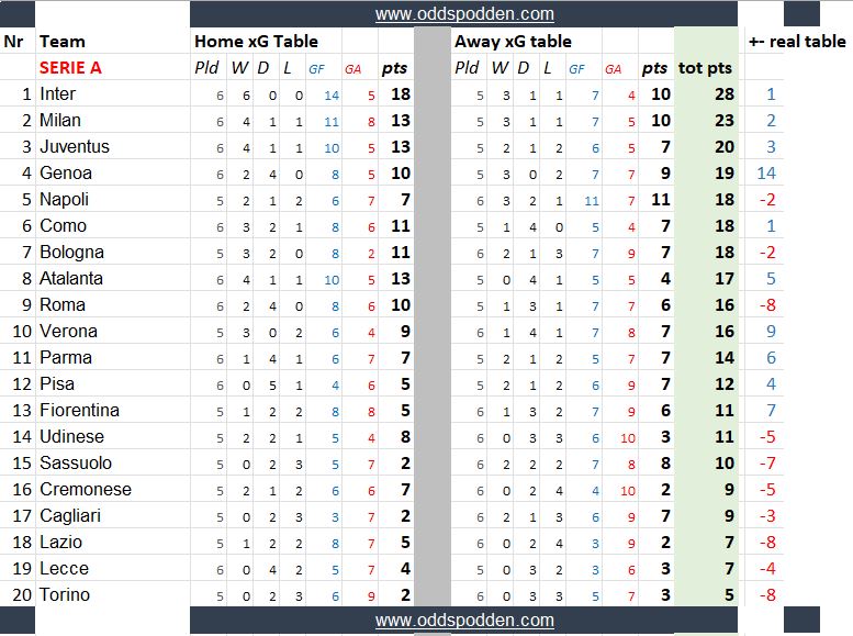 Tabellene (som nok sees enklest på en desktop-PC eller nettbrett) bør være selvforklarende, med unntak av siste punktet - som viser differansen til den reelle tabellen. Positive tall betyr at laget ligger x antall plasser høyere på xG-tabellen enn den reelle tabellen, og motsatt med røde minustall.