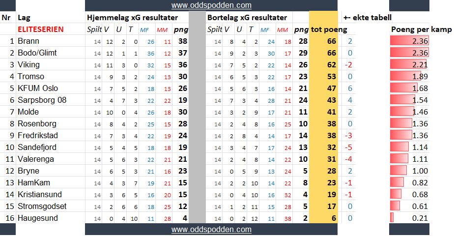 Her får du Oddspoddens tabeller beregnet med expected goals (xG), for Eliteserien, Premier League, Championship, Serie A, Bundesliga, La Liga og Ligue 1.