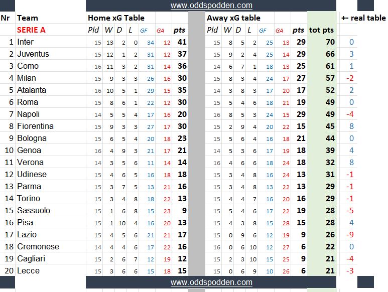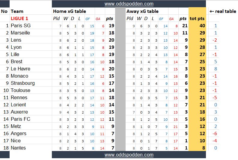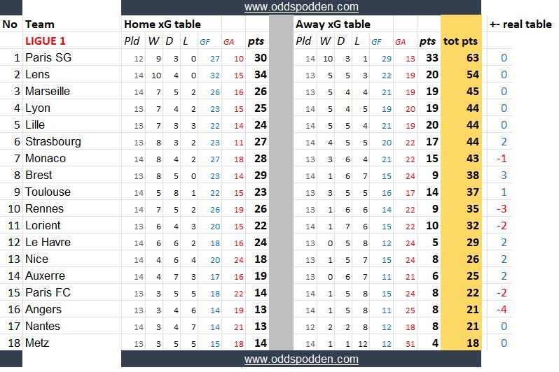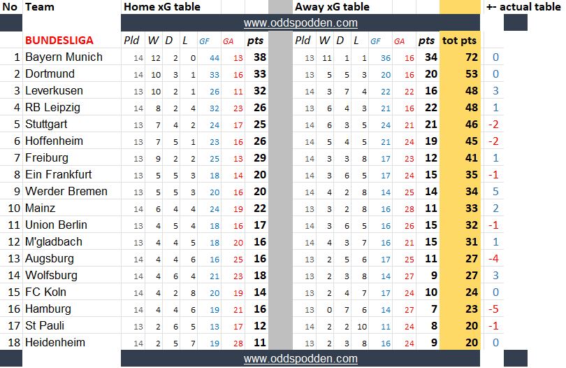 Tabellene (som nok sees enklest på en desktop-PC eller nettbrett) bør være selvforklarende, med unntak av siste punktet - som viser differansen til den reelle tabellen. Positive tall betyr at laget ligger x antall plasser høyere på xG-tabellen enn den reelle tabellen, og motsatt med røde minustall.