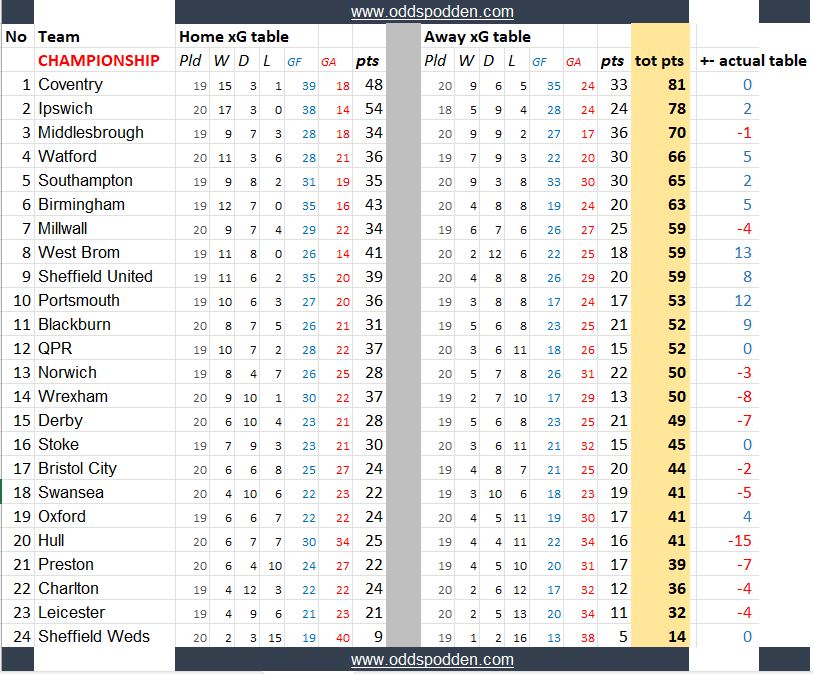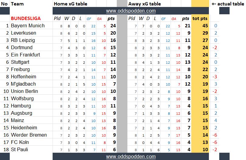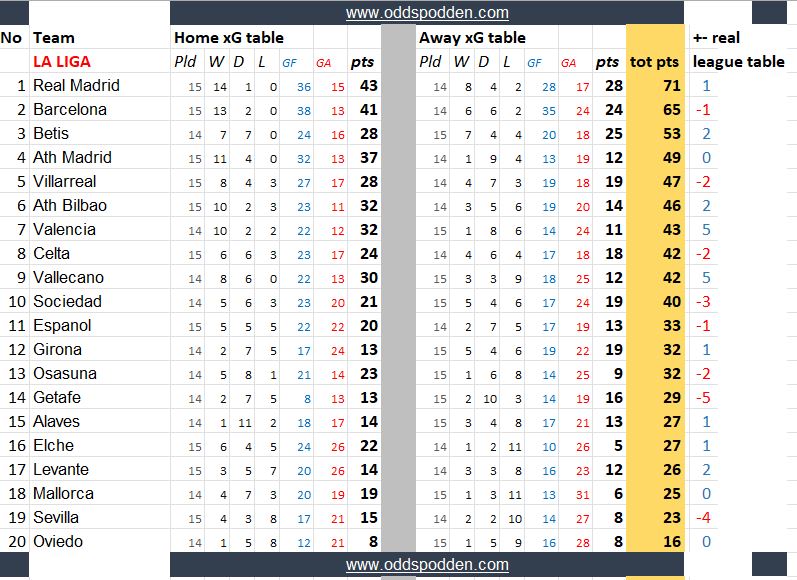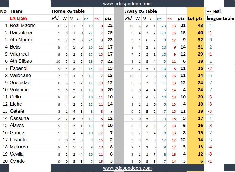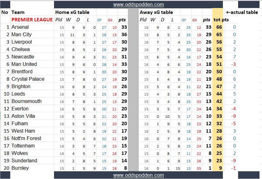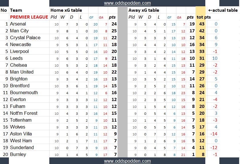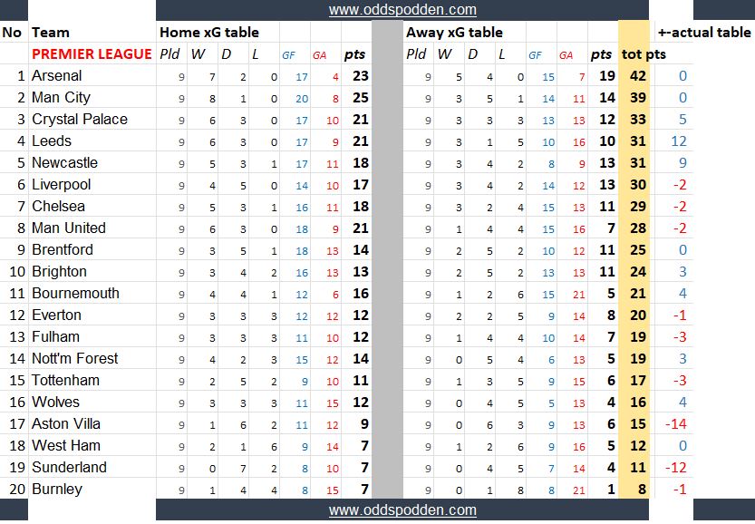 Disse tabellene kan si noe om hvilke lag som har vært heldige/uheldige, overprestert eller underprestert så langt.