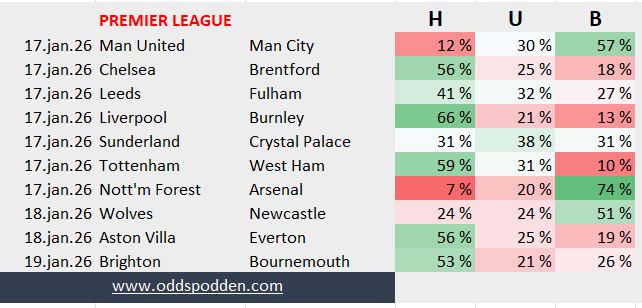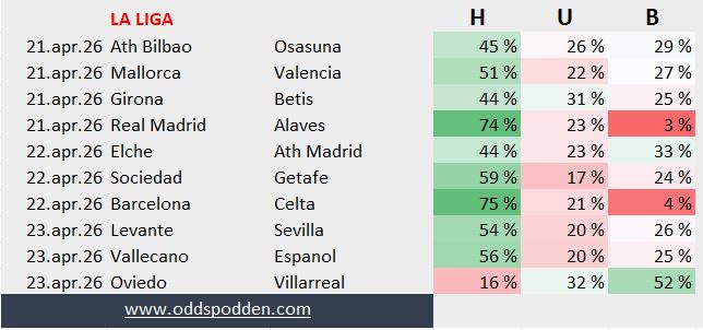 Oddspodden har sin "hemmelige" oppskrift for å generere egne prosenter 1x2 i de store europeiske ligaene, og selvsagt vil vi dele disse med deg. Vi oppdaterer denne artikkelen hver uke med nye tall, gjerne så tidlig som mulig slik at du kan identifisere mulig tidlig verdi hos spillselskapene.