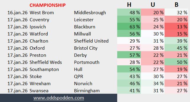 Uavgjort tar vi i Wrexham - Norwich der Sportuna kjører 3,60, men flere kandidater der. Se på prosentene og sammenlign med odds, en grei huskeregler er at 30% krever odds over 3,33 - og selvsagt helst mer.