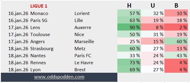 Tips kommer senere, men her har du prosentene! Vi vil nok kikke nærmere på hjemmeoddsen i Lens (opplagt med så kokos høy prosent), nå 1,47 hos Sportuna. Men også outsideren Angers (5,33 hos Sportuna!) og favoritten Rennes må kikkes på. Uavgjort er grei i Monaco og Toulouse med henholdsvis 4,50 og 3,50 i odds hos Sportuna, mens borteseieren lar vi ligge foreløpig...