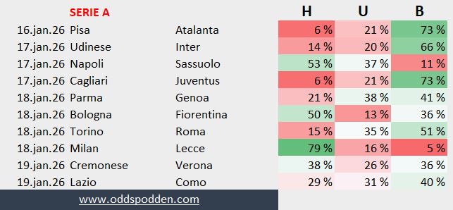 Så var det den grønne bortesiden, og modellen liker både Atalanta, Juventus, Genoa, Roma, Verona og Como! Voldsomt, og det må finregning til. Er mer eller mindre likt mellom Atalanta til 1,53 hos Sportuna og Genoa til 3 blank hos BigClash, får du noe høyere odds kan det avgjøre, så vi ser an denne litt.