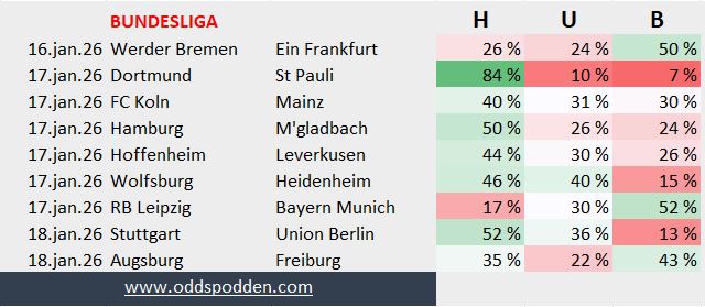 Uavgjort ser vi en fryktelig høy prosent i Wolfsburg - Heidenheim og for så vidt også i både RB Leipzig - Bayern Munchen og Stuttgarts hjemmekamp mot Union Berlin. Alle disse er spillbare, men Wolfsburg-U til 4,20 hos Sportuna er nydelig. I hvert fall i følge systemet...