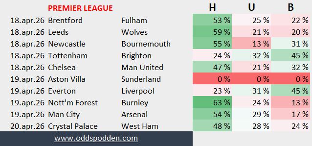 Det er spennende å se om systemet ("Formtall") holder sesongen ut når desperasjon, nerver og slikt gjør seg virkelig gjeldende. Denne uka lukter systemet mest hjemmeseier i Brentford, Newcastle og Crystal Palace, uten at det er voldsom verdi noe sted. I tillegg er de tre spillene omtrent identiske i prosentmessig verdi. Dermed blir det små marginer rundt oddsen som avgjør hvilket vi velger ut til regnskapet - du kan selvsagt spille alle tre. Trivelabet skiller seg ut med sine 2,12 på Brentford, mens Arcticbet skinner med markedsledende 2,38 på Crystal Palace - som blir hovedspillet.