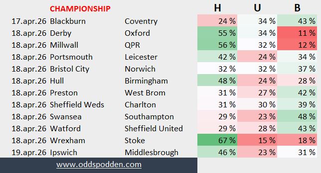 Flere hjemmeseier-kandidater her, og noe overraskende er det absolutte bunnlaget Sheffield Wednesday det heteste spillet med 31% vinnersjanse og 4,92 i odds hos Arcticbet. Så er det som sagt bare å regne på andre, nesten alle hjemmelagene har noen få prosent verdi i Championship denne gangen.