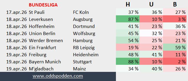 Uavgjort med hele tre klokkeklare, mistenkelig gode kandidater. Frekt å prøve et 2/3 system? St. Pauli - Köln til 3,35 hos Arcticbet, Freiburg - Heidenheim til 4,25 hos Zoccer og Gladbach - Mainz til 3,50 hos Unionbet er alle utmerkede valg. Selv ville vi kanskje valgt en av de andre, men systemet vil helst ha 4,25 hos Zoccer i Freiburg-kampen. På poengdeling, altså!