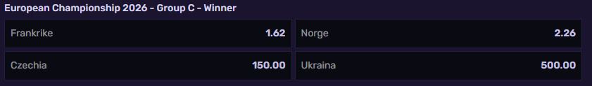 Norge er i gruppe C sammen med Frankrike, Tsjekkia og Ukraina. Oddsen på gruppevinner ser slik ut (fra Sportuna):