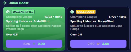 Oddsboosts: Unionbet gir deg eksklusive oddsboosts på de mest populære idretter og kamper, for eksempel får du nå supre boosts på Bodø/Glimt denne uka! (se under) og også 100 i odds på at Norge vinner fotball-VM ! (ordinær odds 26)