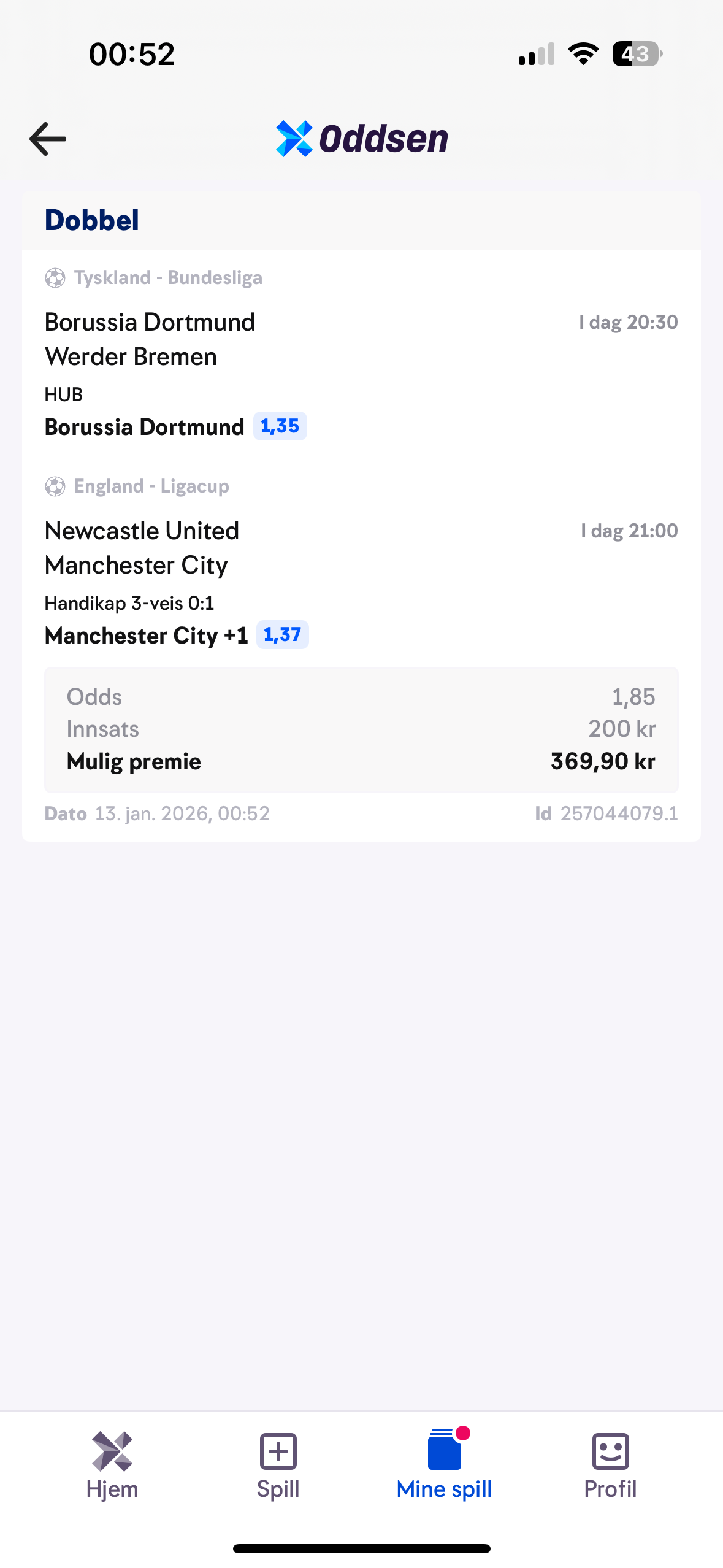 Bayern er suverene i Bundesliga, og det er bare å ta av seg hatten for dem. Ikke ên eneste gang har de gått av banen denne sesongen uten at det har blitt minst 3 mål i kampen de har spilt. Så derfor: 1,25 i odds er jo litt spedt, men det er i alle fall verdi. 1,25 på at det scores minst 3 mål i kampen her totalt. Bayern bøtter jo inn mål, og Harry Kane er målmaskinen.